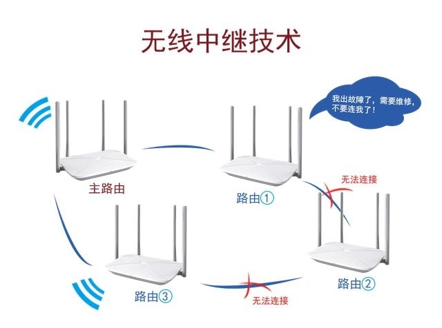此外,在无线中继设备扩展无线网络的过程中,一旦路由1损坏,路由2也将无法正常上网。