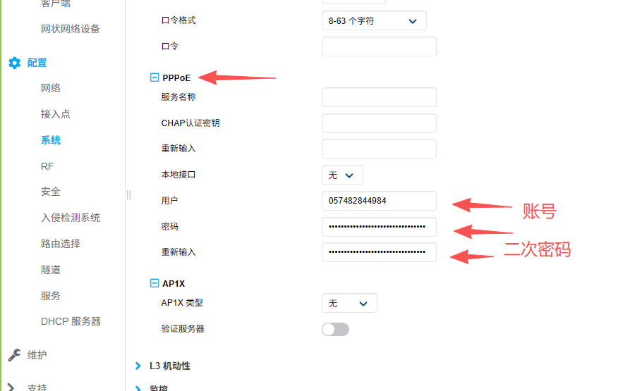 7.开始设置PPPOE账号 照猫画虎将可以,不过要填写自己的PPPOE账号。
